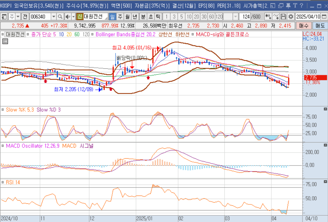 - 2025년 4월 10일 종가: 2,735원 (하루에 +17.38% 급등)