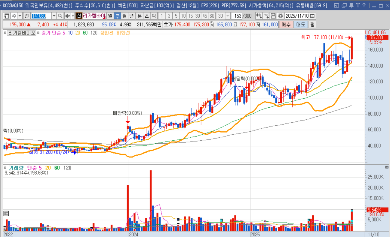 리가켐바이오(141080)가 2025년 11월 13일 (전일 대비) 급등하며 167,900원을 기록했어요. ADC(항체-약물 결합체) 기술의 글로벌 선두기업인 리가켐바이오는 시가총액 약 6조 2,000억 원 규모로, 전 세계 주요 제약사(양센·얀센·오노약품 등)와 기술이전 계약을 체결하고 있습니다.