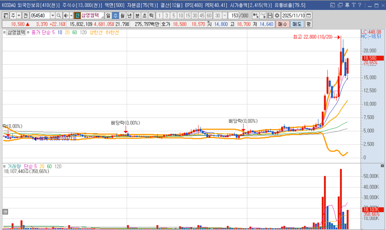 삼영엠텍의 52주 최저가는 8,380원이에요. 현재 18,580원은 이 가격에서 무려 122% 상승한 수준이랍니다. 4월 이후 꾸준한 상승세를 이어가고 있다는 게 정말 놀라워요. 특히 9월 이후 본격적인 상승이 시작되었는데, 이는 3분기 실적 기대감이 반영된 거라고 봐도 됩니다.