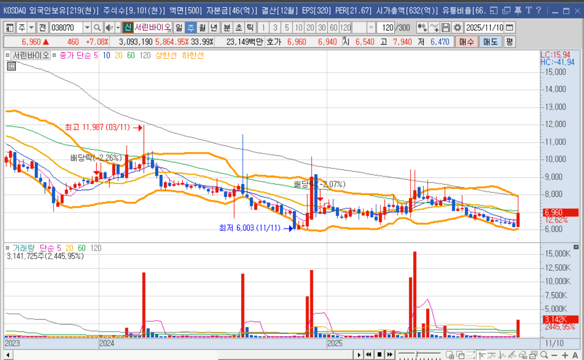 11월 13일 기준 서린바이오의 52주 최고가는 10,149원인데 현재 주가 6,960원은 이 수준까지 약 45% 남겨둔 상태예요. 반대로 52주 최저가 5,988원 대비로는 16% 올라온 거죠. 최근 상승세가 꾸준하지만 아직 고점까지는 여유가 있다는 뜻이에요. 이는 추가 상승의 여지가 충분하다는 좋은 신호랍니다.