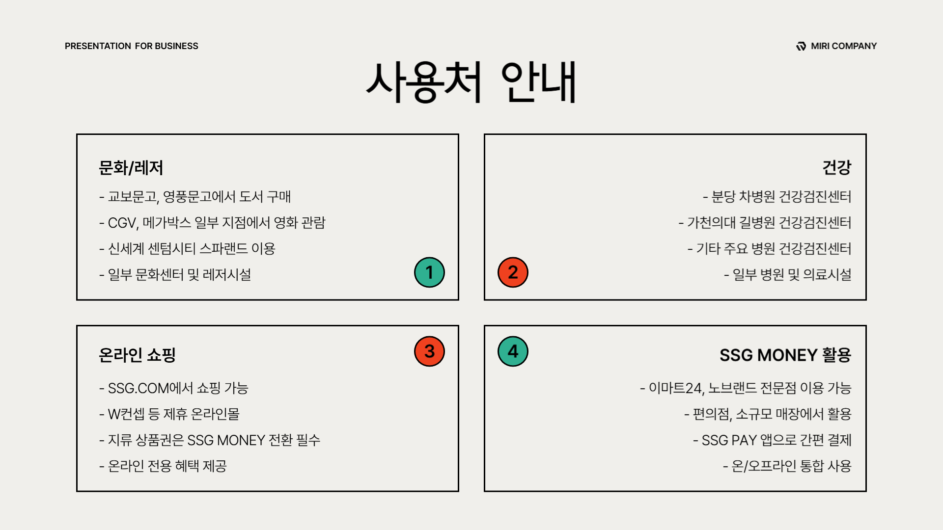 - 쇼핑 (오프라인/온라인): 신세계백화점 전점, 이마트, 신세계 프리미엄 아울렛, 스타필드, SSG.COM (SSG PAY 전환 필수)