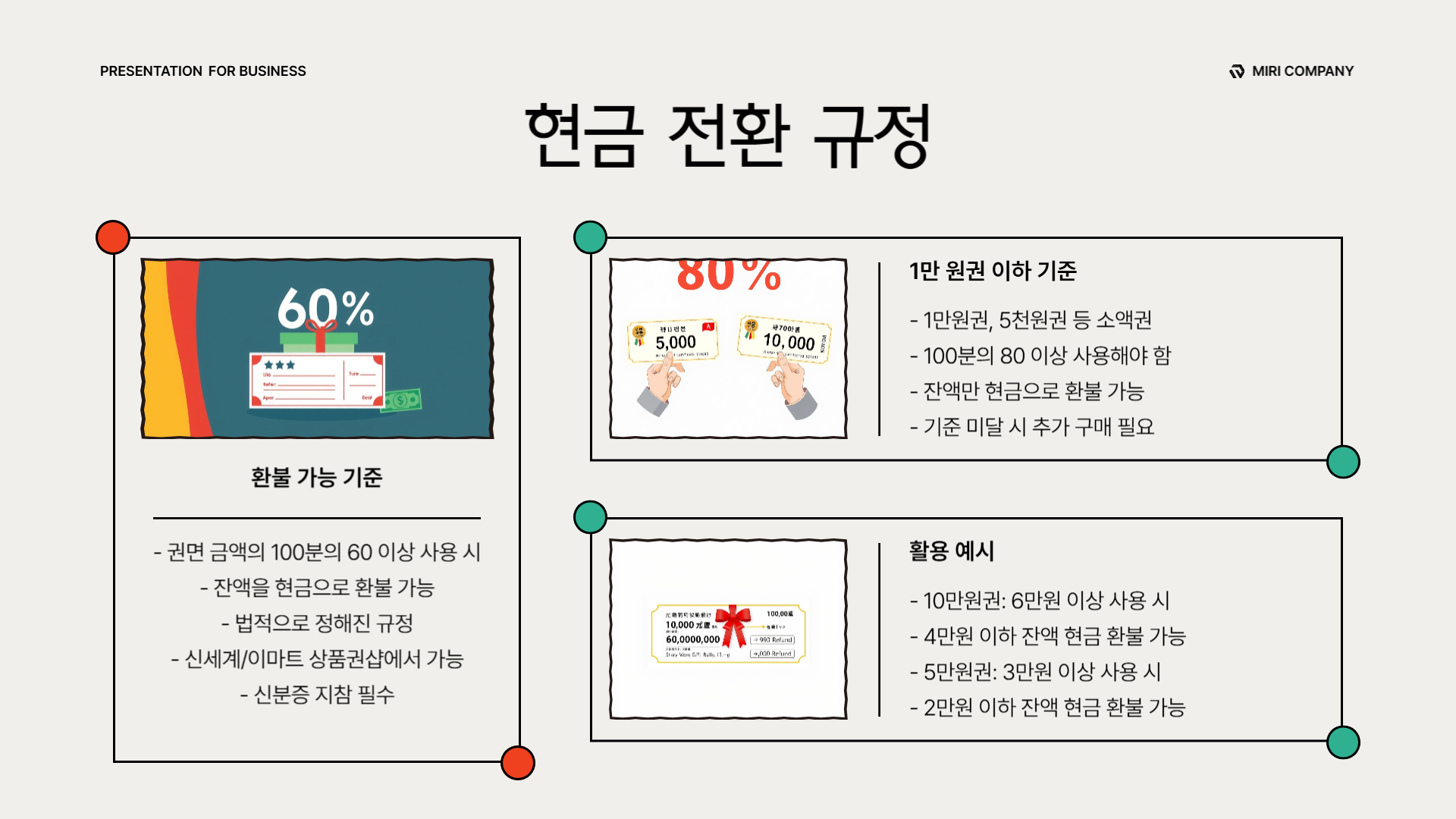 - 예시: 10만원권 상품권을 사용한다면, 6만원 이상 사용해야 나머지 잔액(4만원 이하)을 현금으로 돌려받을 수 있습니다.