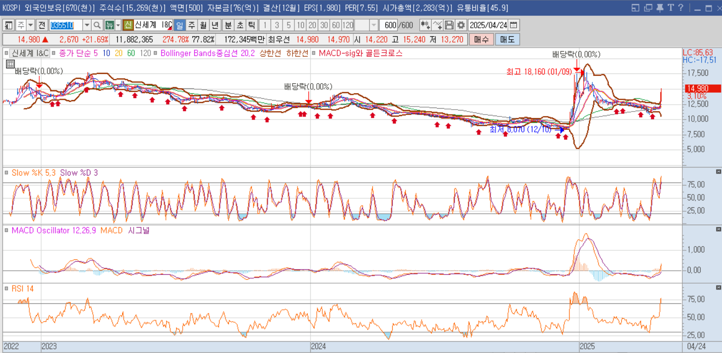 최근 신세계I&C 주가는 2025년 4월 24일 기준으로 14,980원까지 급등하며 강한 상승세를 보이고 있습니다. 아래는 투자자들이 참고할 수 있는 지지선과 저항선을 중심으로 한 매수/매도 팁입니다.