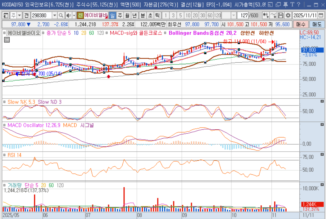 에이비엘바이오 주가는 2025년 10월 들어 급등하면서 52주 최고가 111,200원을 기록했는데요. 11월 7일 현재는 101,300원으로 고점 대비 약 9% 조정을 받고 있답니다. 52주 최저가는 26,400원으로, 연초 이후 주가가 무려 268% 이상 상승한 셈이에요. 이러한 급등은 GSK와의 4조원 규모 기술이전 계약 체결, 상반기 흑자전환 등 굵직한 호재들이 연이어 발표되면서 나타난 현상인데요. 현재 주가는 단기 이동평균선들 위에 위치하고 있지만, 고점 대비 조정을 받으면서 과열 부담을 해소하는 과정으로 보입니다.