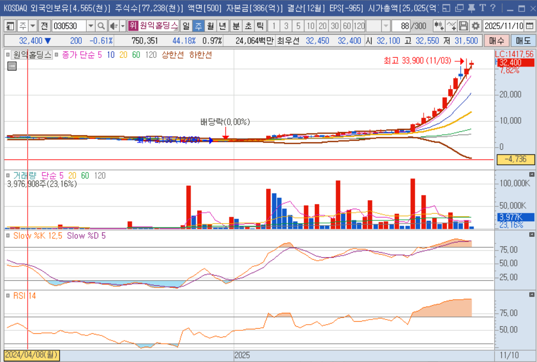 원익홀딩스의 차트를 보면 정말 인상적이에요. 9월 중순 약 12,000원대에서 시작해 지금 32,000원대까지 왔거든요. 이건 약 180% 이상의 엄청난 상승이랍니다. 중요한 건 이 과정에서 거래량이 평소의 3~4배 수준으로 터졌다는 거예요. 이건 개인 투자자들이 단기로 사고파는 게 아니라 기관이나 외국인 같은 큰손들이 본격적으로 들어왔다는 신호죠.