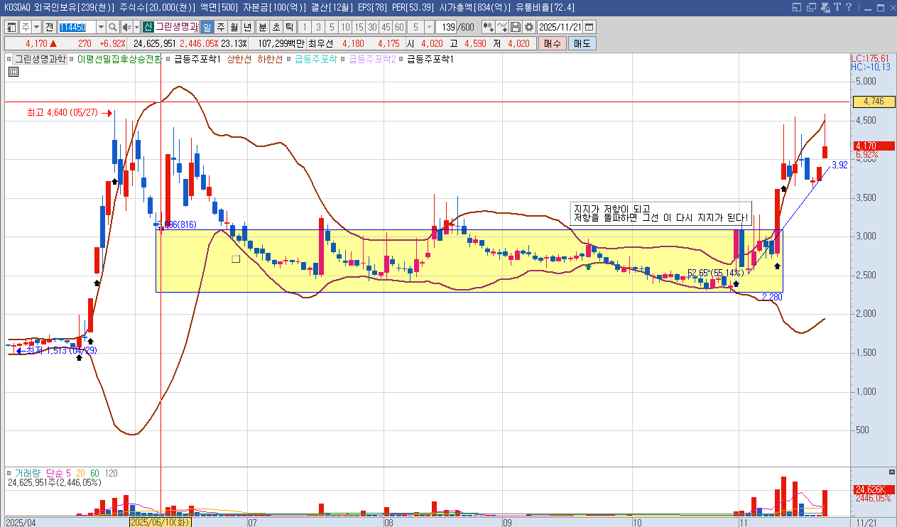 52주,120일 신고가, 역사전신고가가 나오면 새로운 가격이므로 이 주식을 보유하고 있는 대부분의 사람들이 수익원인 상태이다.