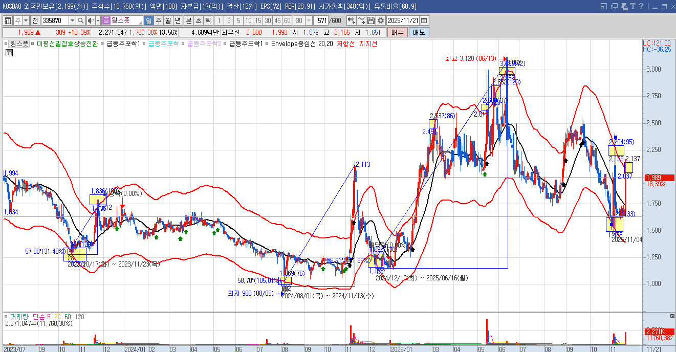 오늘 상한가에 근접한 윙스풋차트에 적용해보았다.