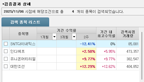 성과검증 기능으로 11월 2주간 모두 검증해보니 11/6일 SNT다이내믹스를 제외하고 모두 상승하긴했다.