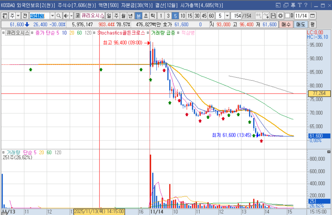 2. 큐리오시스 기술적 관점 - 따따블 후 급락, 조정 시작