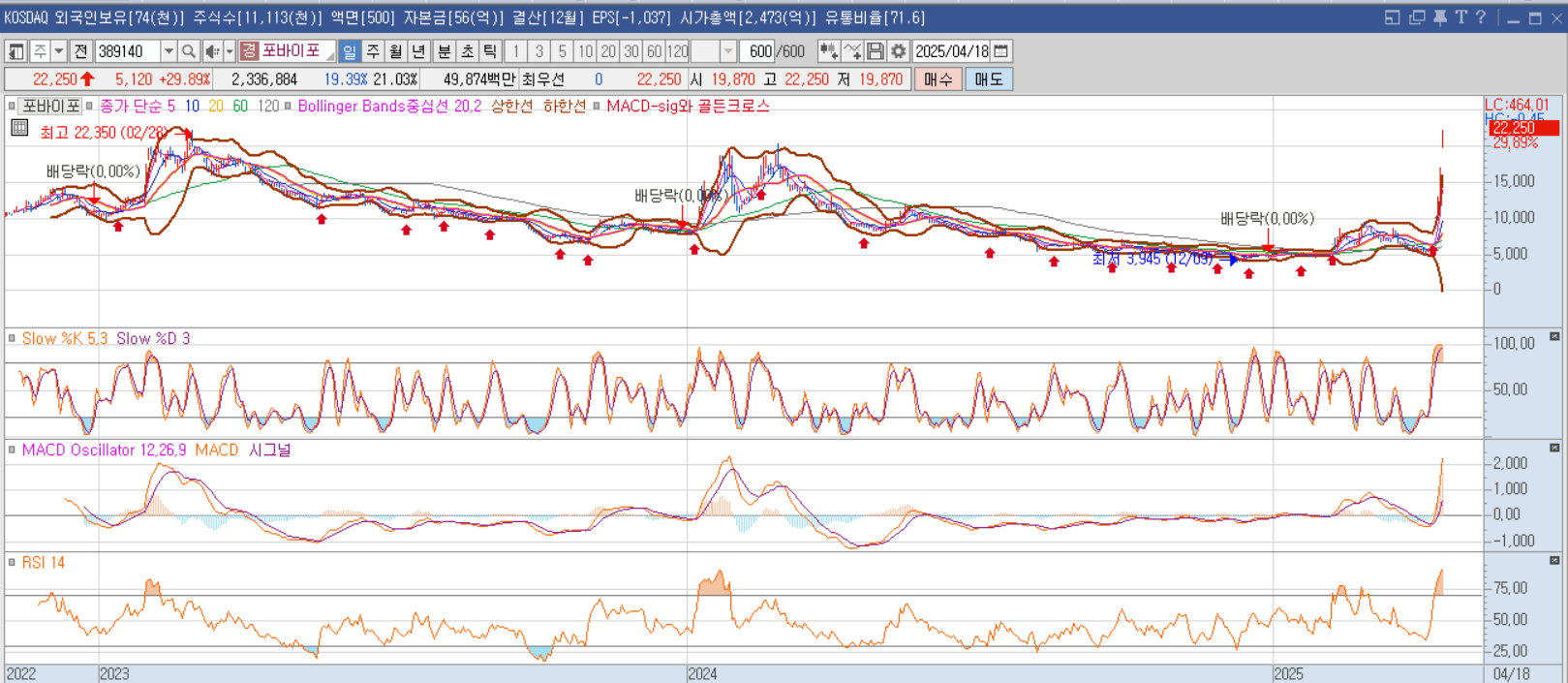 포바이포 주가가 오늘 22,250원으로 전일보다 29.89%(+5,120원)나 크게 올랐어요. 차트를 분석해보니 몇 가지 중요한 기술적 특징들이 보여요.
