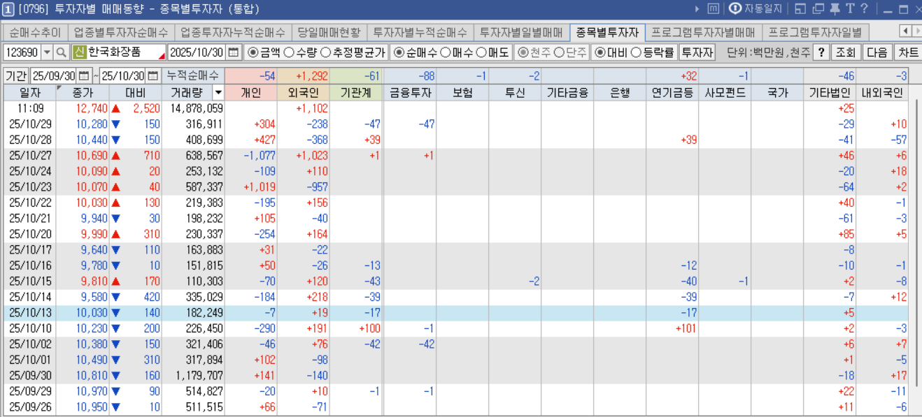 한국화장품의 수급 상황을 보면 10월 30일 외국인과 기관이 동반 순매수하며 강한 매수세를 보이고 있어요.