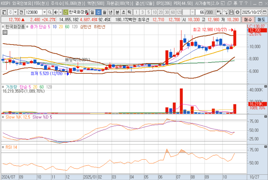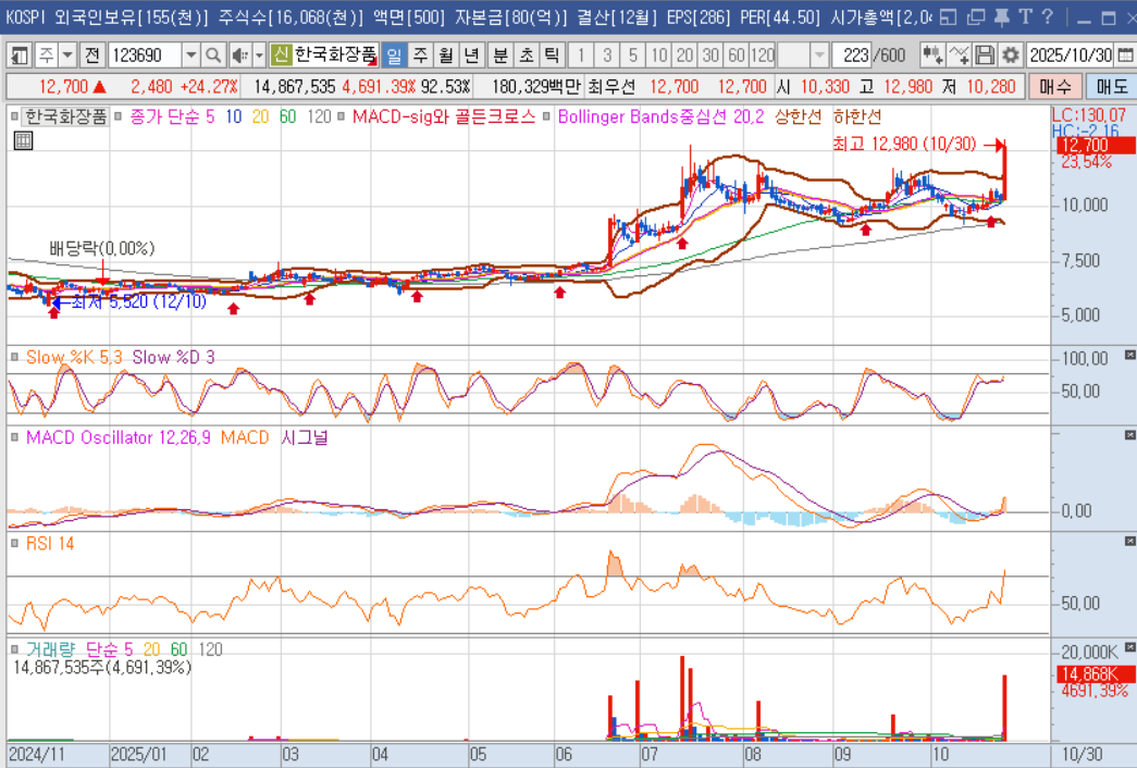 한국화장품 차트를 살펴보면 2024년 저점 5,520원에서 시작해 2025년 10월 30일 12,980원까지 무려 135%나 상승하며 폭발적인 반등세를 보였어요.
