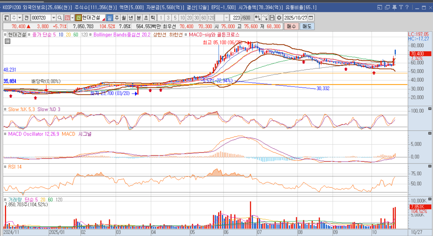 하지만 7월 중순 이후 건설업계 불확실성과 실적 우려로 주가가 조정을 받으면서 10월 중순에는 5만원대 중반까지 하락했답니다.  그런데 최근 미국 원전 수주 소식이 터지면서 10월 24일 66,600원(+16.64%), 10월 27일 70,400원(+10.36%)으로 급등하며 반등 신호를 보내고 있어요.