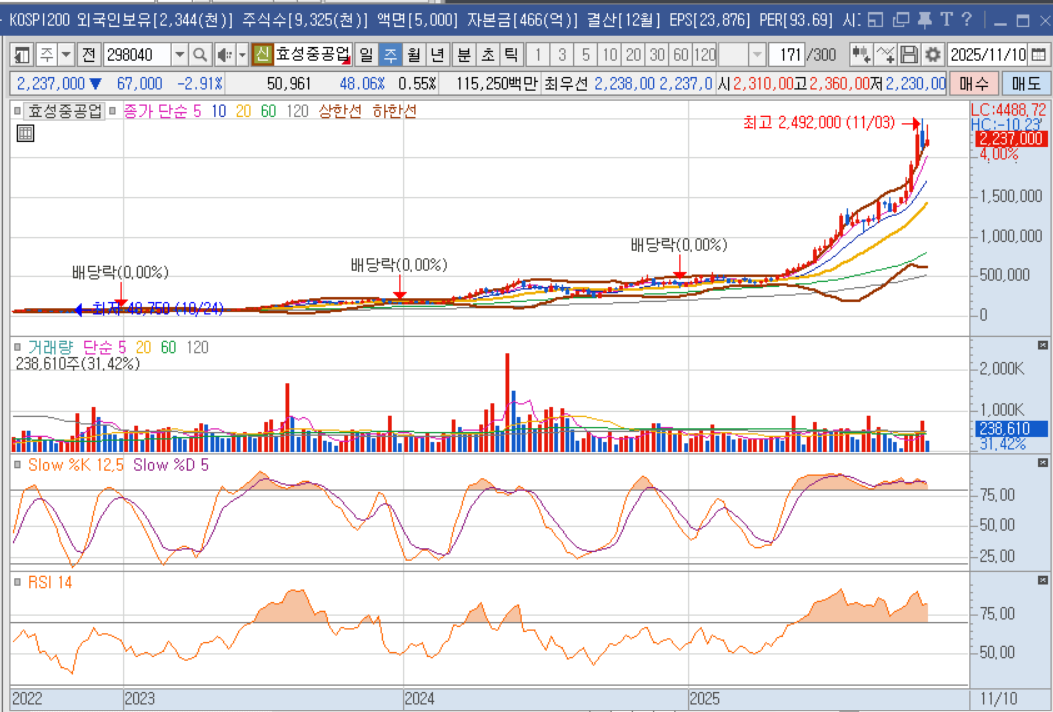기술적으로 효성중공업은 올해 벌써 180% 이상 상승한 강세주예요. 다만 최근 10일 간 약 8% 조정을 받으며 매물을 소화하는 중이에요. 이는 단순한 하락이 아니라 고평가 우려에 따른 건강한 조정으로 평가돼요. 차트상 52주 최고가는 2,492,000원으로, 현재 2,237,000원은 고점 대비 약 10% 정도 하락한 수준이거든요.