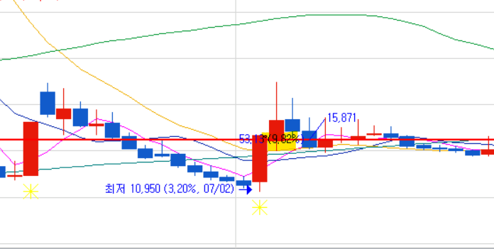 중간에 상한가 한번이고 나머지는 다 갭뜬 종목, 상한가랑 갭뜬게 3번이라 3번쨰 음봉저가매수를 했다고 보면