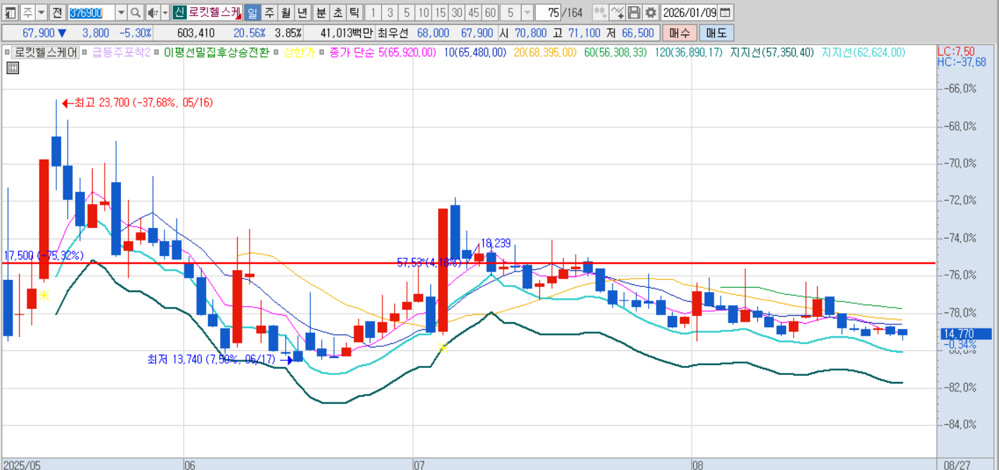 수급 구조 단타 세력·개인 투자자 매수 집중, 거래량 급증 → 상한가 연속 패턴 형성. 초기 매집 세력의 차익 실현, 상한가 추격 매수자들의 손절 출회로 매도 우위 전환.