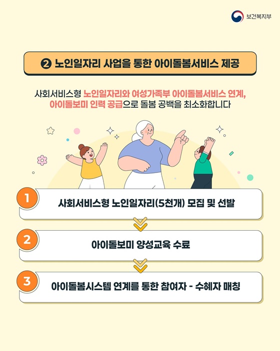 또 하나의 좋은 소식은 노인일자리 사업을 통해, 어르신들이 아이돌봄 서비스에 참여할 수 있게 된다는 점입니다. 이렇게 하면, 어르신들은 일자리를 얻고, 아이들은 더 나은 돌봄을 받을 수 있겠죠?