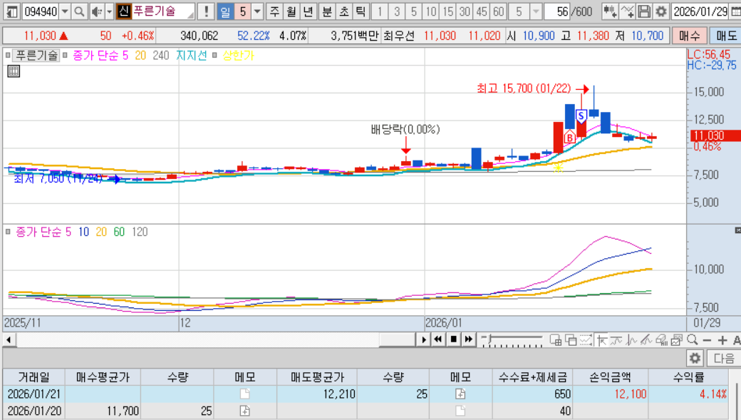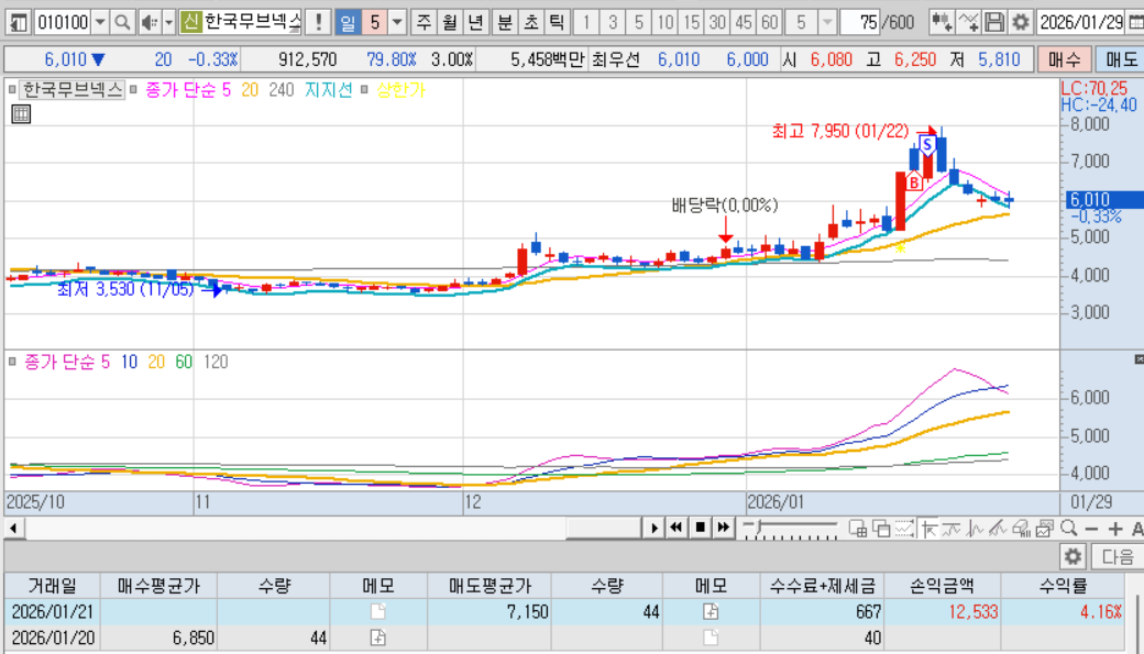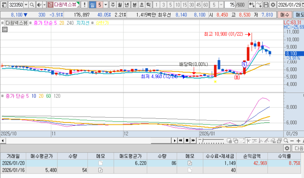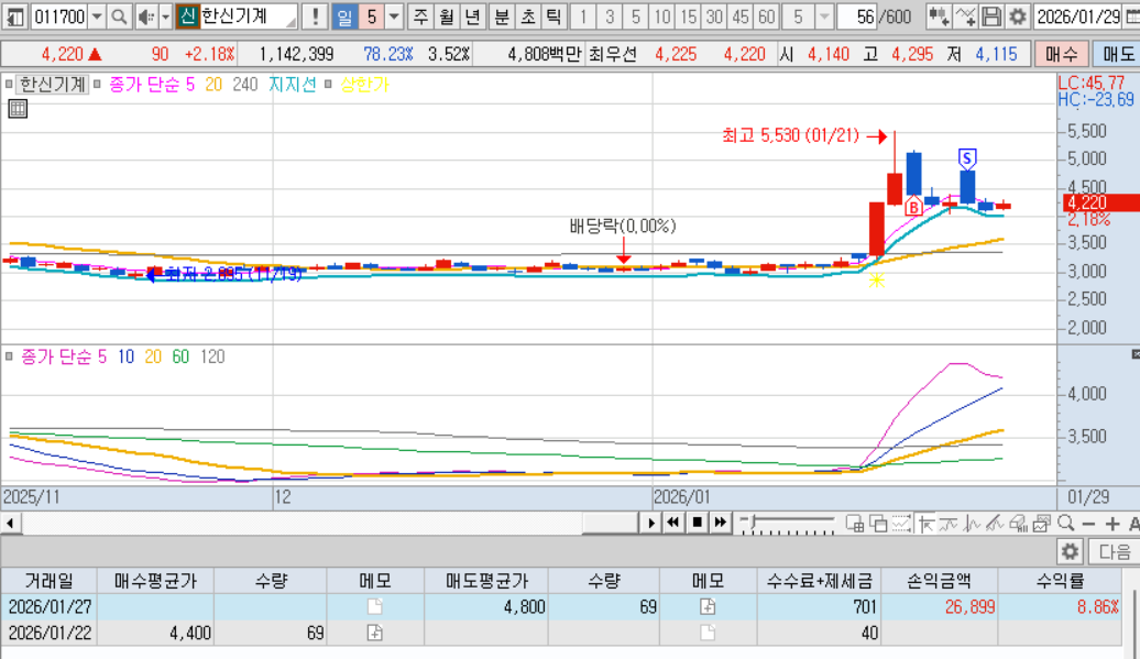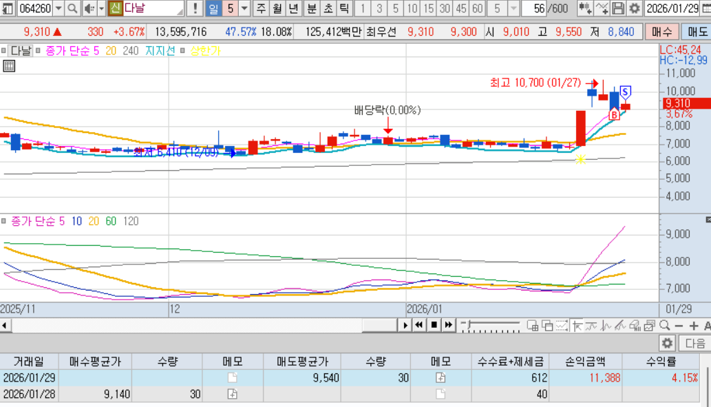 매도 : 다음날 매도체결. 내가 좋아하는 적당히 출렁출렁하는 차트, 확실한 테마, 많은 거래대금, 내가팔고 내려가는 기분좋은 케이스 ㅋㅋㅋ