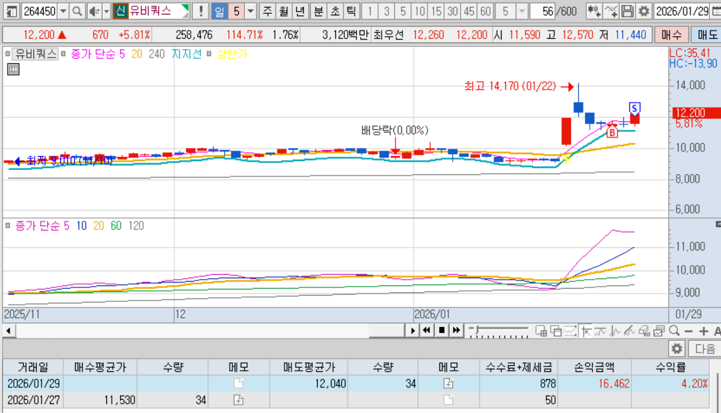 관심종목에 상한가를 알려주고 추천을 받았는데 유비쿼스가 내기법과 잘맞을 것같다고해서 보니 괜찮아보여서 매수했다.