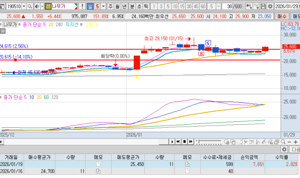 최근 3연상해서 2음봉을 기다렸다. 2음봉의 저가에서 매수대기.