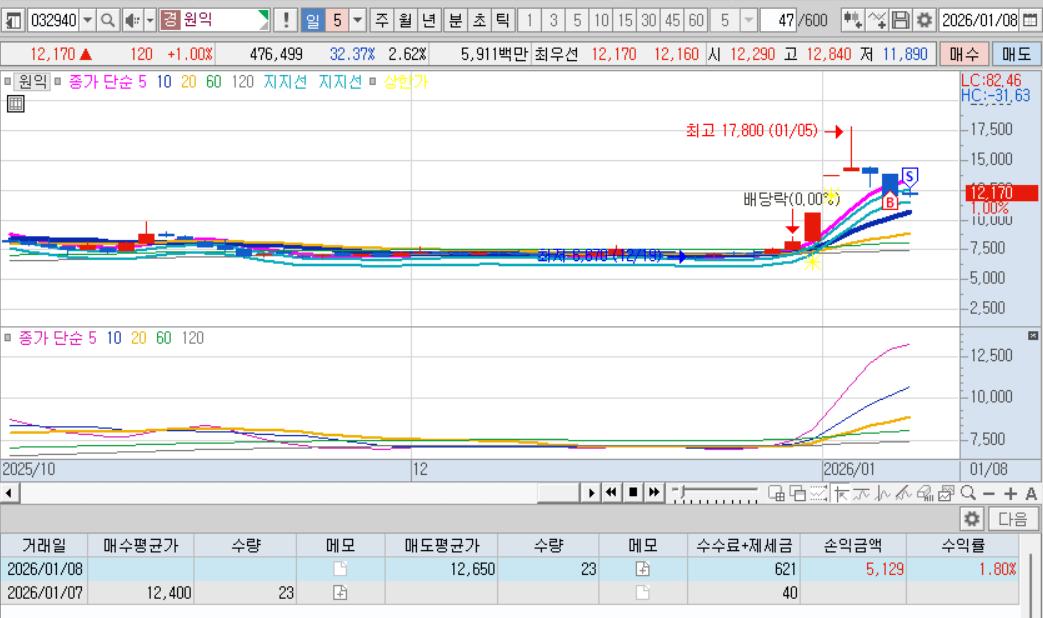 첫음봉보다 더아래에서 매수하긴 했다. 이제부터 세운 규칙에는 안맞는 종목이지만 저렇게 날아가는거 보면...참..