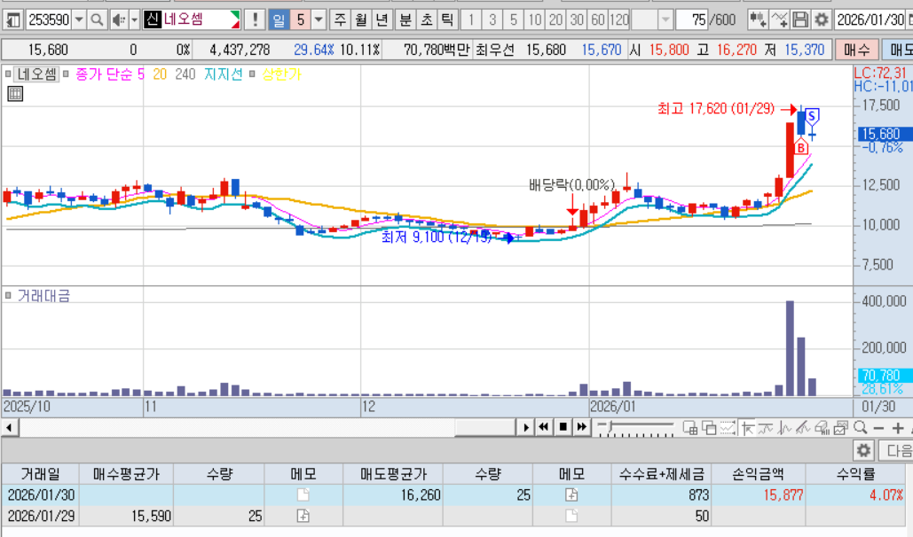 오늘 오전 어제 매수한 네오셈 매도.