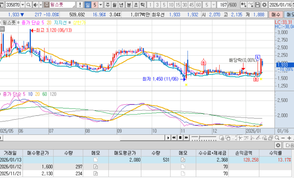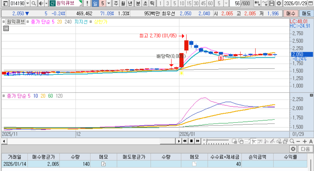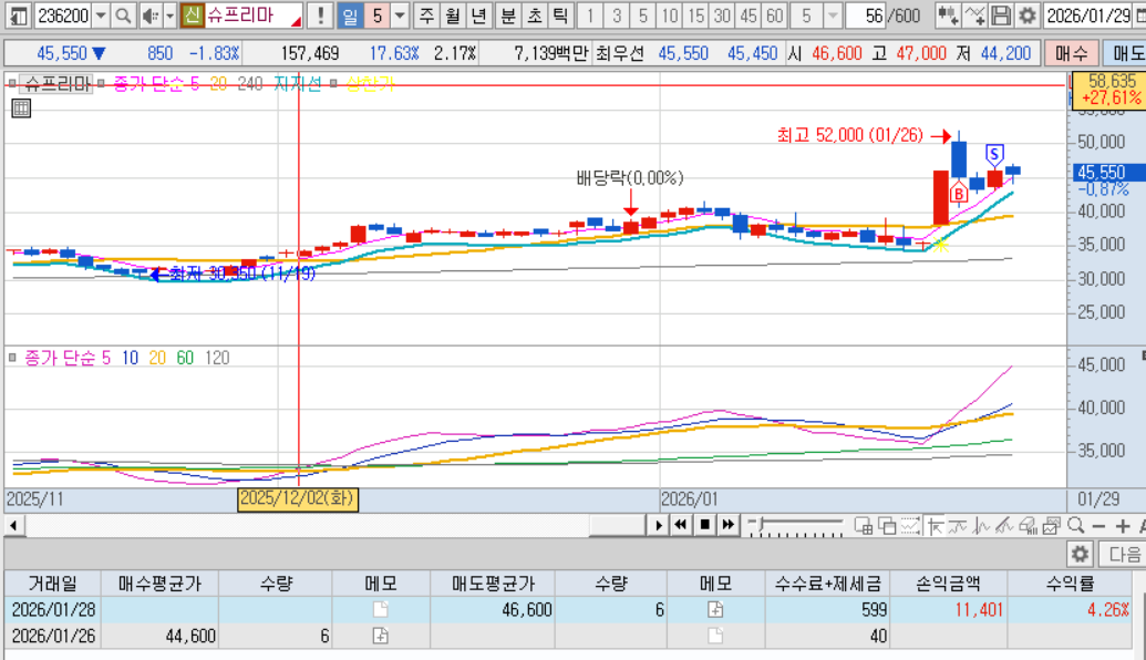 매수: 265억, 상한가 다음날 음봉만들어주고, 그다음날 장초반에 저가매수체결, 50분만에 익절매도.
