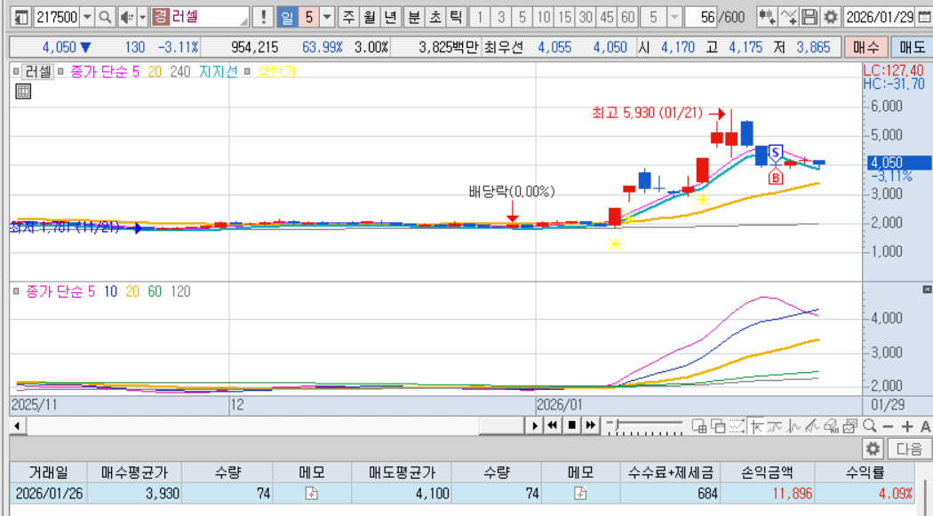 매도 : 4% 매도대기. 이경우는 첫음봉 저가 아래 기법에서샀다면 실패했거나 추가매수가 필요했던 자리였겠다.