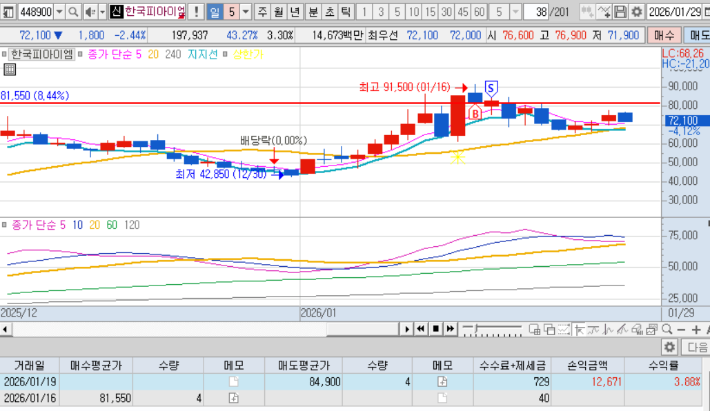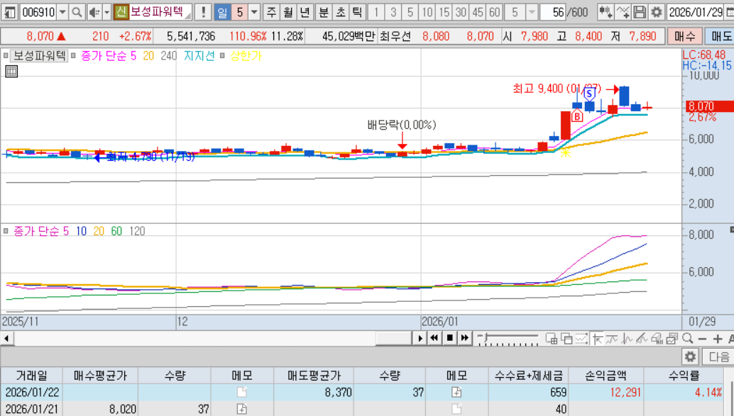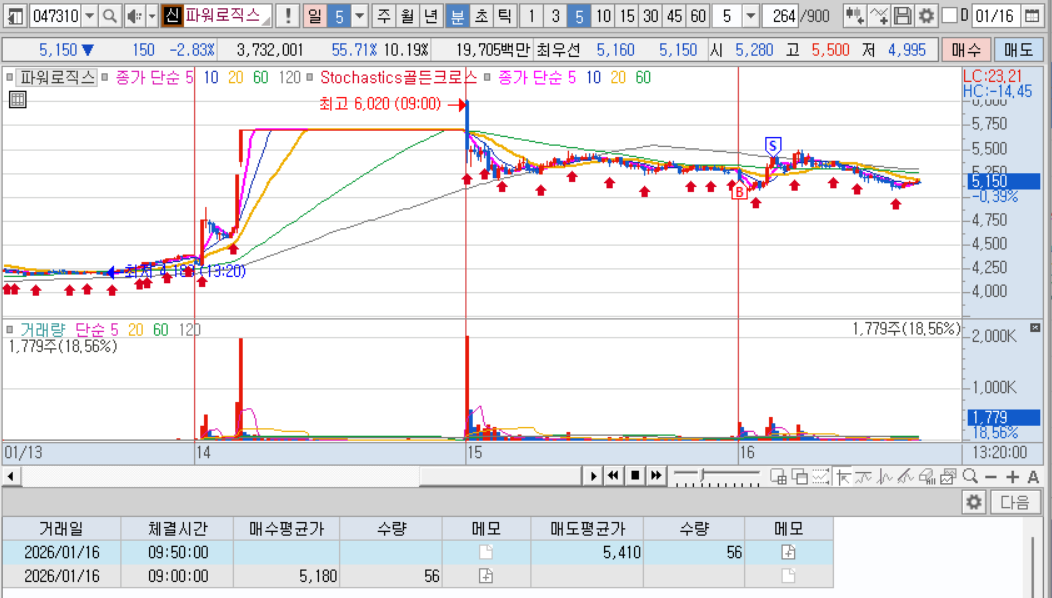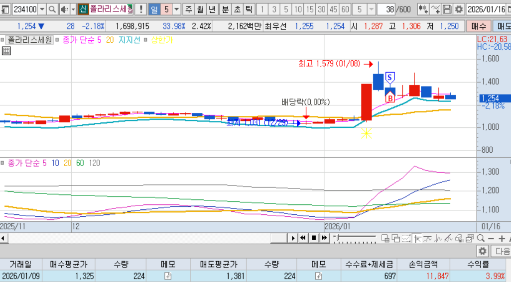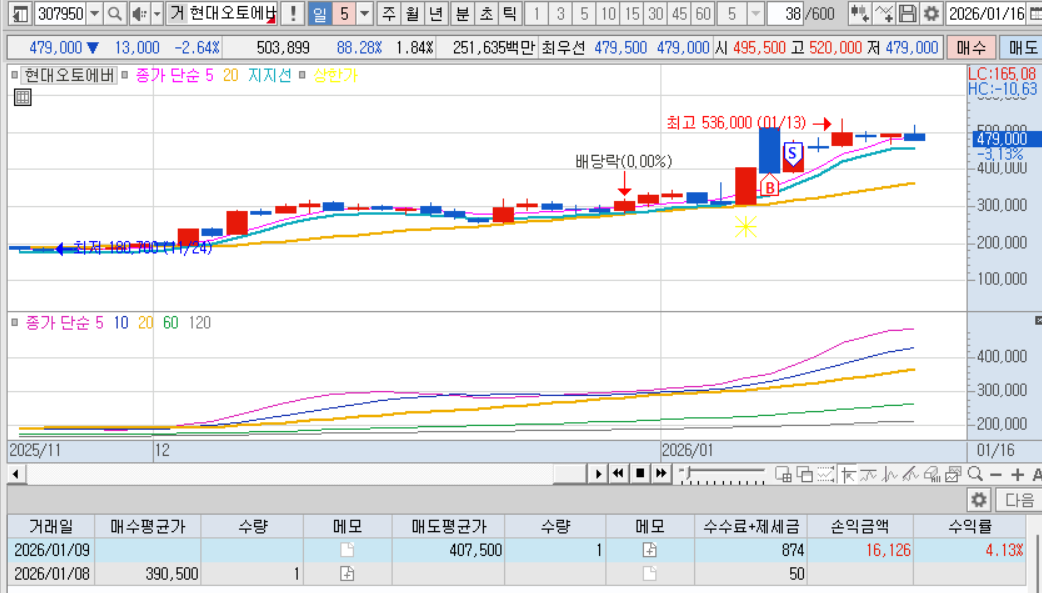 매도 : 다음날 매도체결. 내가 좋아하는 적당히 출렁출렁하는 차트, 확실한 테마, 많은 거래대금, 내가팔고 내려가는 기분좋은 케이스 ㅋㅋㅋ