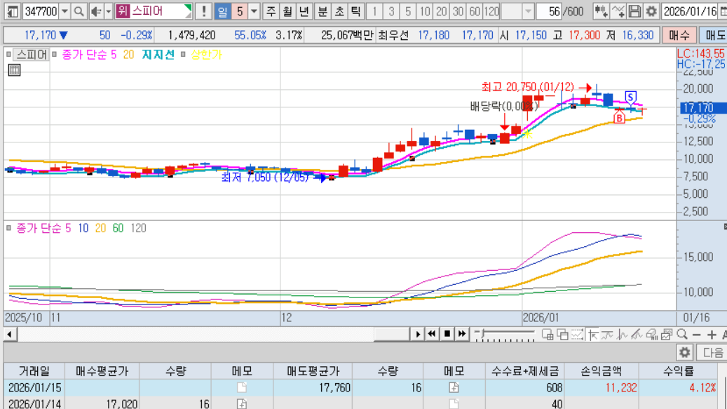 매수 : 거래대금 1175억 상한가 첫음봉 아래 5일 선돌려차기 선 쯤에서 매수. 고민하다가 좀 뒤늦게 매수했는데 다행히 2일후에 익절