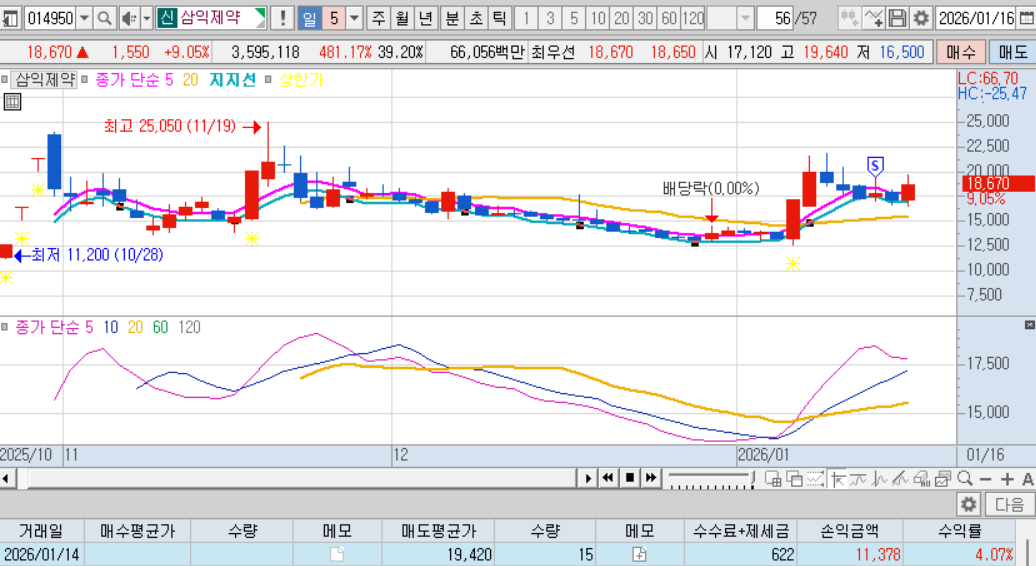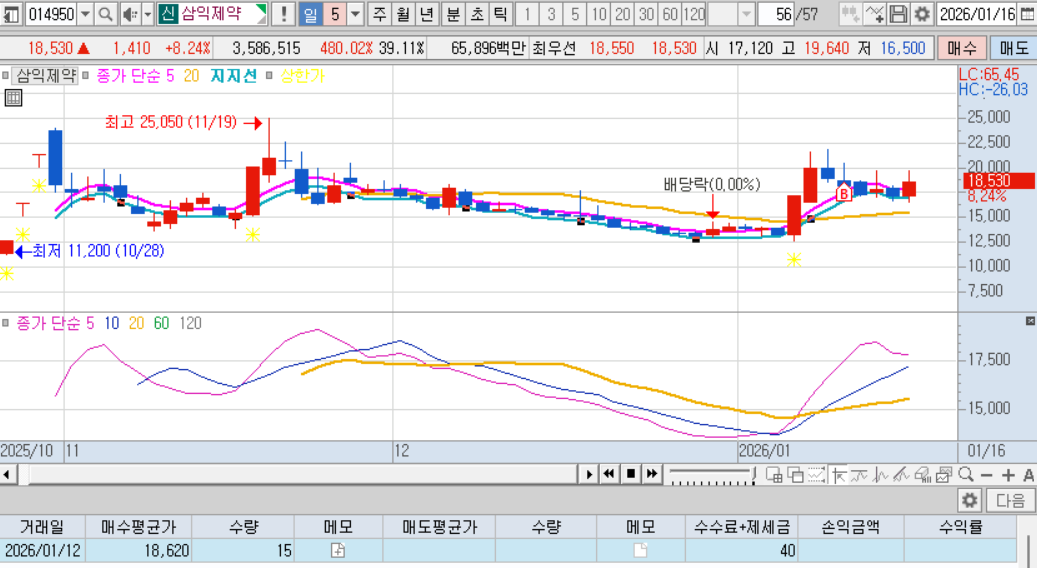 최근 3연상해서 2음봉을 기다렸다. 2음봉의 저가에서 매수대기.